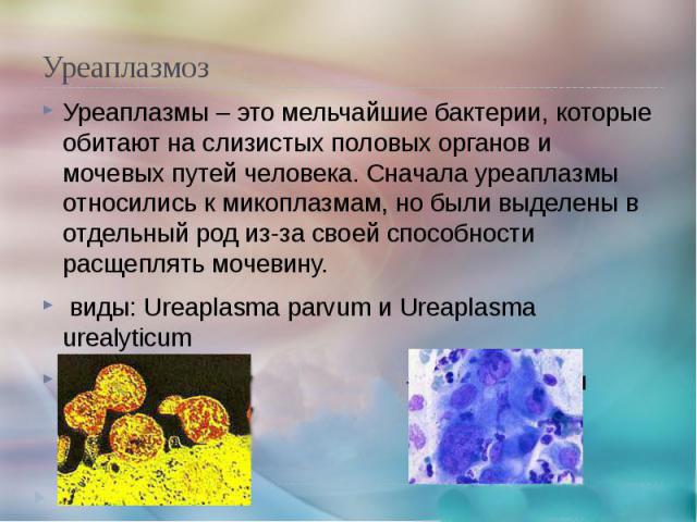 Бактериология выделяет 7 видов бактерий семейства микоплазменных, среди которых клинически значимыми являются 2 вида: Биовар Parvo и биовар Т-960. Впервые эта бактерия была обнаружена в 1954 году, с тех пор начались исследования парвум и ее влияния на слизистые оболочки мочеполовой системы. Клиническая микробиология выявила ряд отличительных особенностей бактерий уреаплазмы, которые позволяют отнести данный вид к патогенно-опасным. Свойства тенерикуты (чрезвычайно мелкой бактерии) охарактеризованы следующим образом: