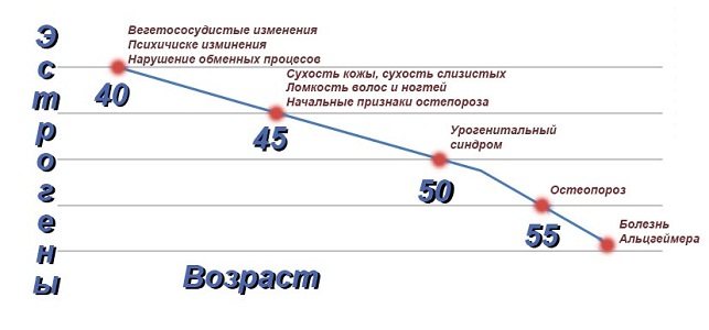 На данном этапе жизни организм женщины остро ощущает недостаток эстрогенов. Яичники данный гормон не вырабатывают. Происходит интенсивное появление морщин, снижается эластичность кожи, происходит выпадение волос.