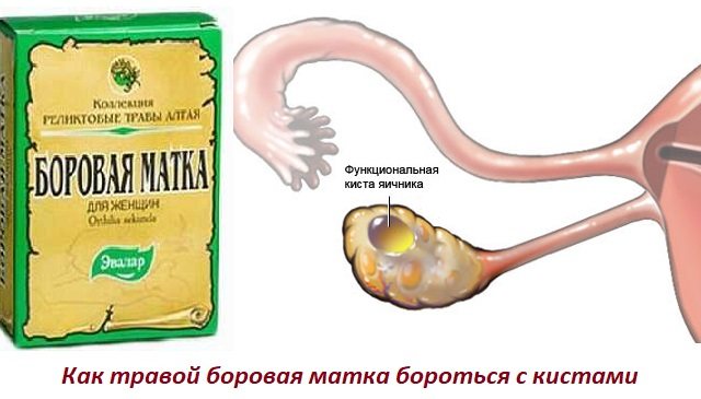 Не менее часто у женщин может образовываться фолликулярная киста яичника. Она формируется, когда зрелая яйцеклетка в силу определенных причин не может выйти из фолликула. В результате в нем накапливается жидкость, что вызывает его увеличение. Чтобы избавиться от такой кисты, женщины используют следующий рецепт. 30 капель спиртовой настойки с боровой маткой растворяют в стакане воды. Пьют 3 раза в сутки за один час до приема пищи. Терапия продолжается до полного исчезновения опухоли.