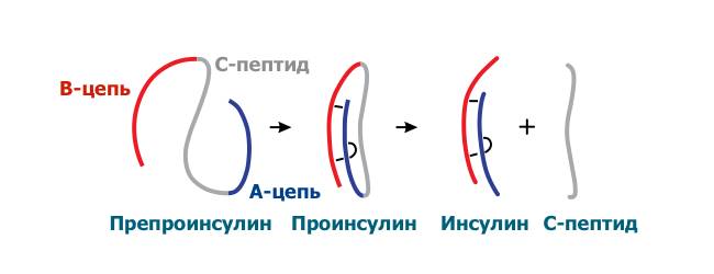 В поджелудочной железе (островковой части) образуются предшественники инсулина. Вначале синтезируется 4 белковых фрагмента – пептиды А, В, С, L. Последний сразу отделяется от препроинсулина, а С пептид предназначен для соединения А и В цепей проинсулина. Когда гормон «готовится» к выходу в кровь, от него ферментами удаляют соединительный фрагмент С. Оставшиеся протеины А и В – это и есть активный инсулин.