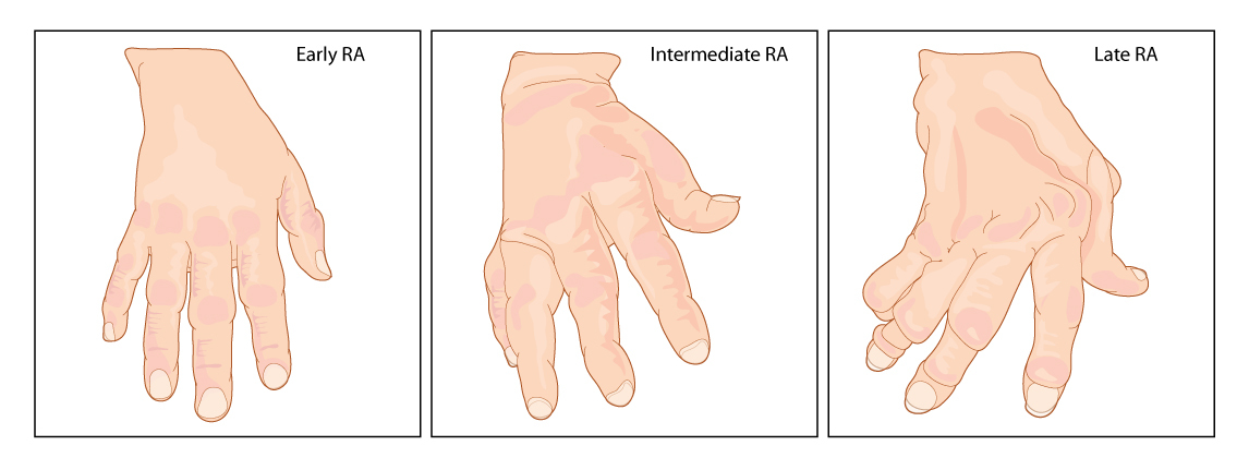 При РА происходит разрушение суставных поверхностей и изменение связок, что приводит к характерным деформациям: